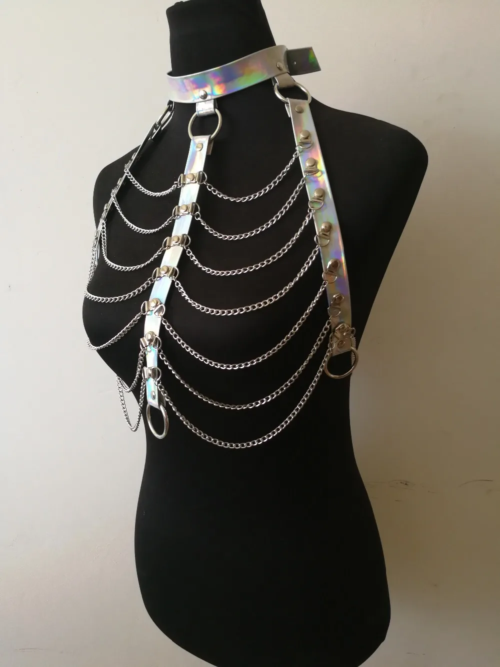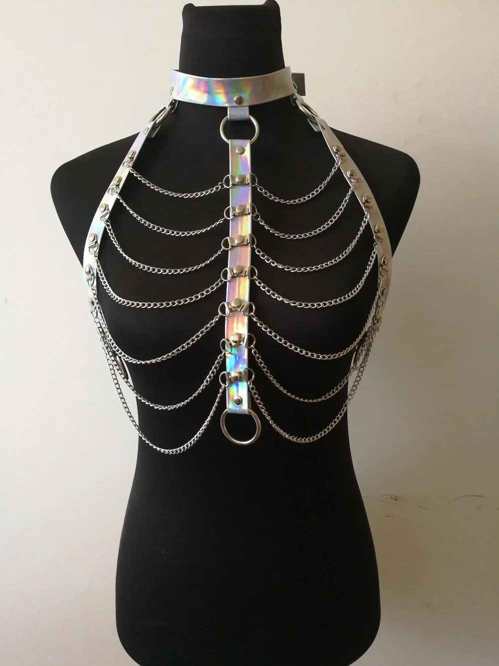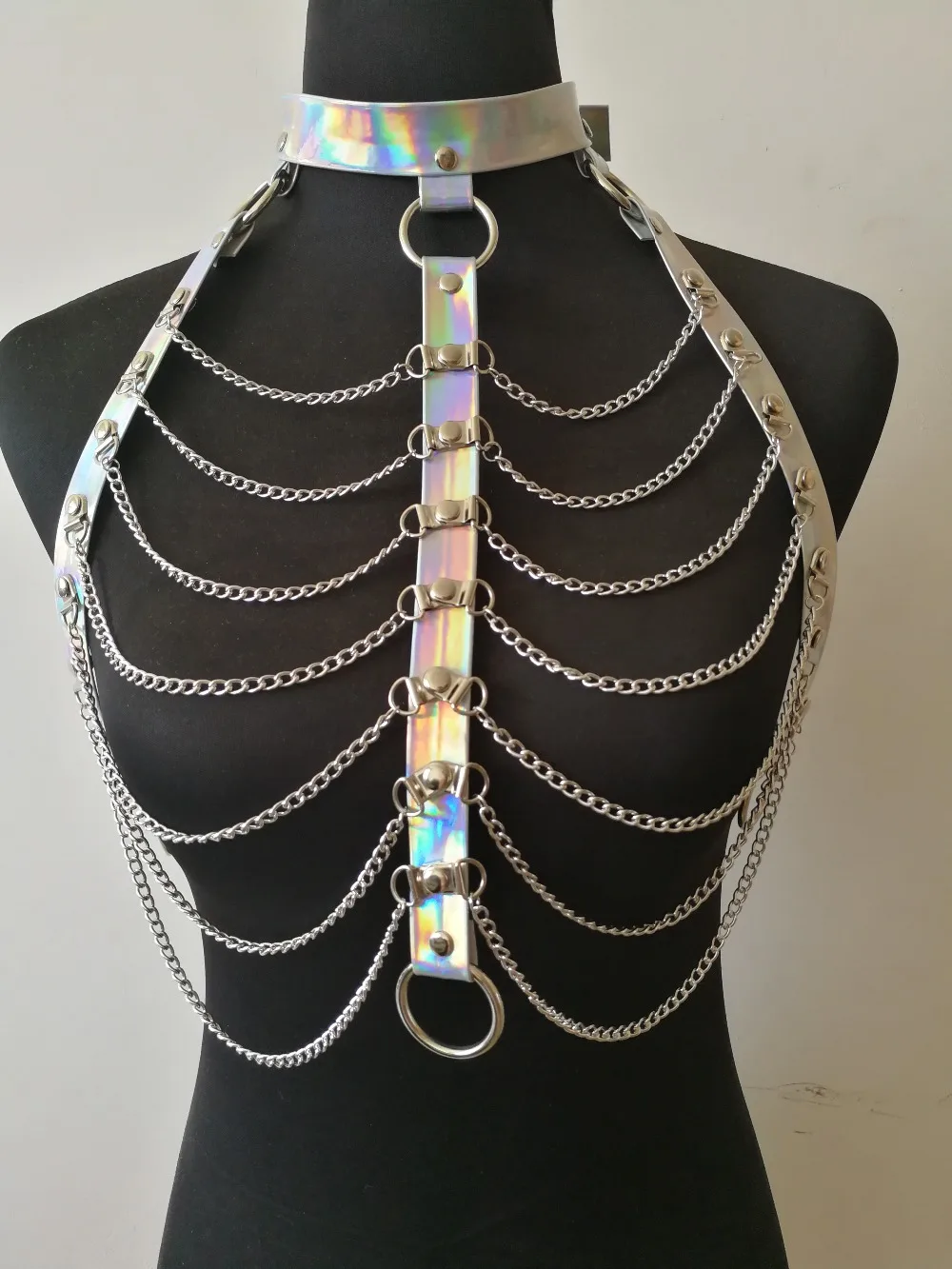 BEST QUALITY New Fashion PU Leather Style B783 Women Harness Laser Leather Bra Chain Collar Choker Silver Chains