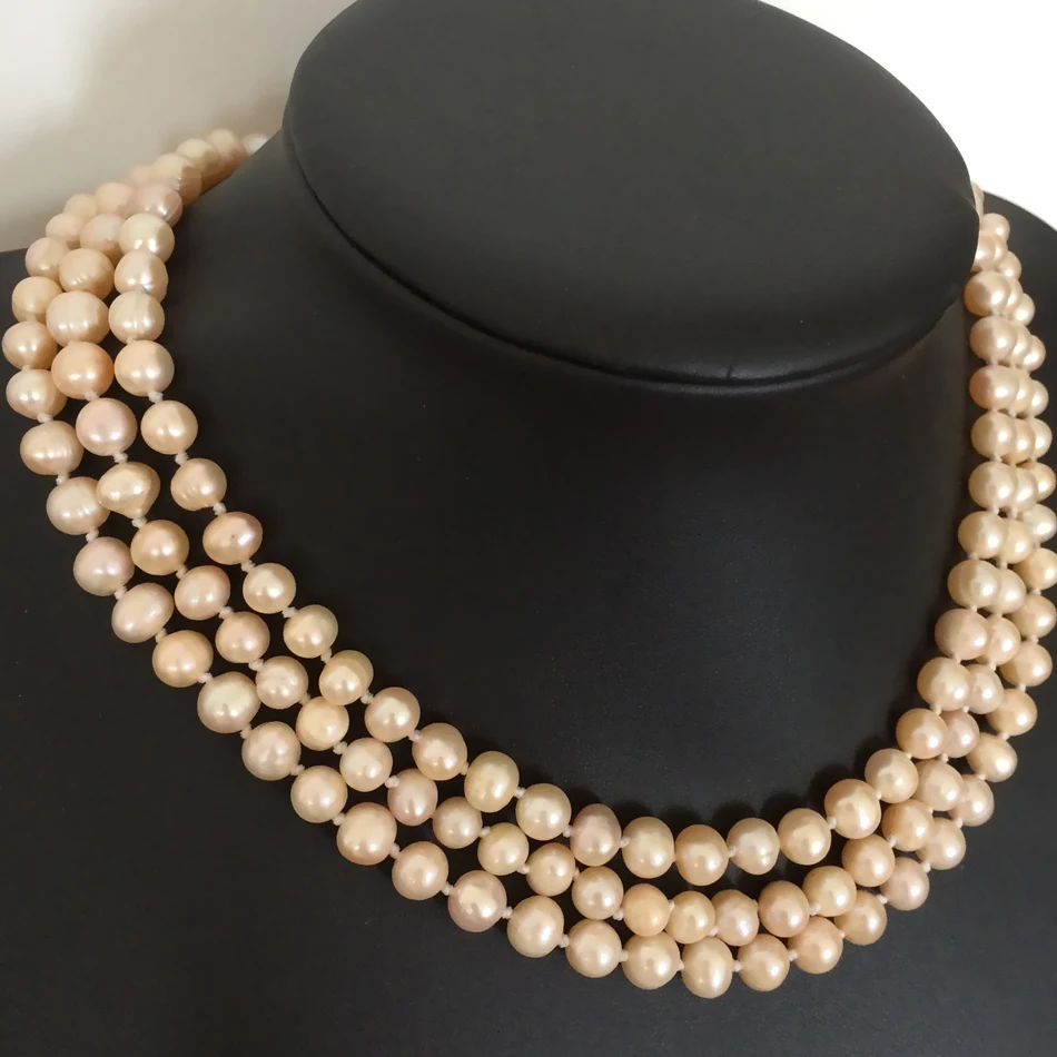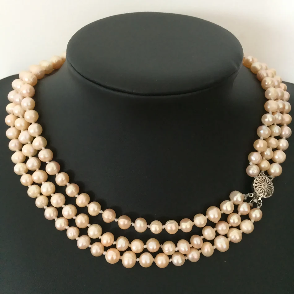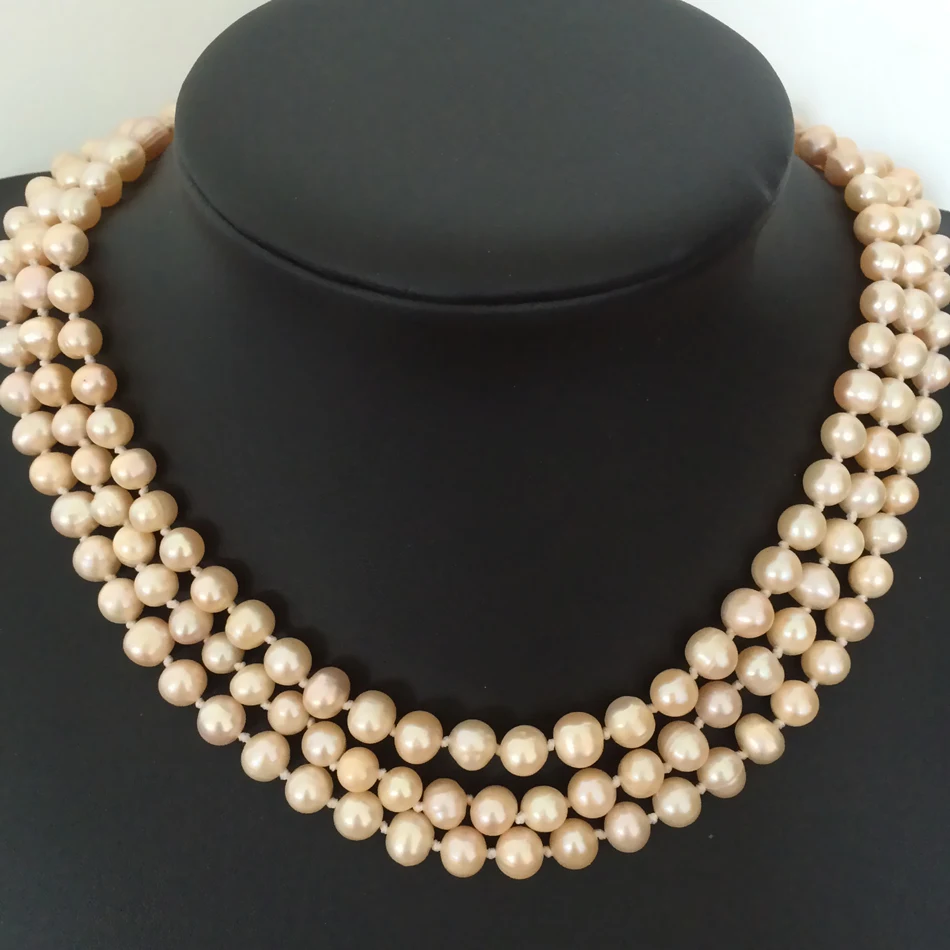Charming 3 rows natural freshwater trendy light orange pearl 7-8mm round beads woman necklace jewel